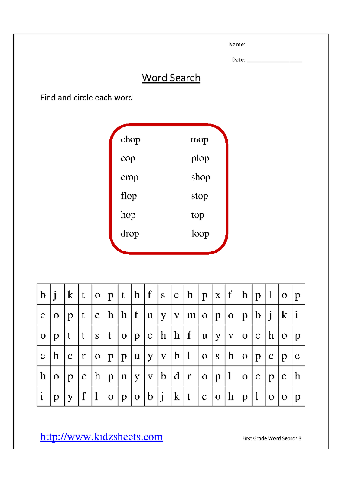 First Grade Word Search. Printable randomly generated First Grade site word, word search puzzles. A variety of options are available including font size, font style, lowercase or uppercase letters, grid shape, word placement, and more.