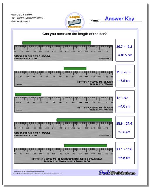 Centimeters to Millimeters (cm to mm) conversion calculator for Length conversions with additional tables and formulas. Measurement worksheets for measuring the length of an object placed at arbitrary whole centimeter positions on a metric ruler. Displaying all worksheets related to - Centimeter And Millimeter.